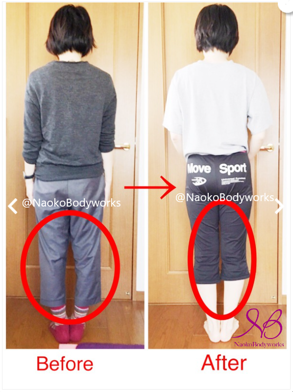 Naoko自身もおしりの筋肉、骨盤からアプローチして、左右の歪みも改善し、骨盤は締まり、O脚も改善し、14kgスルッと痩せて、外反母趾まで改善しました。
